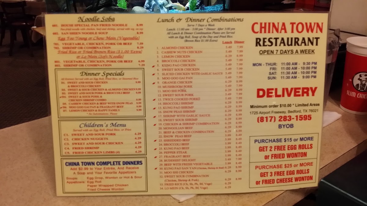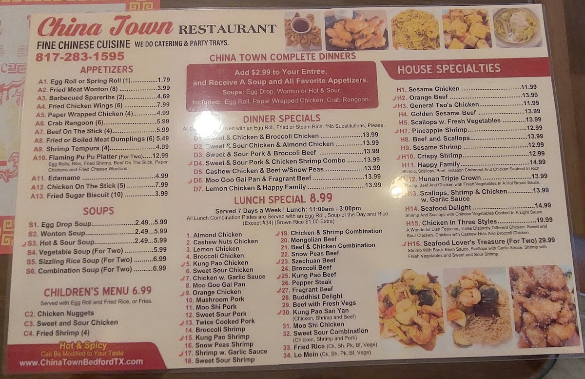 Welcome to China Town Restaurant Bedford, where an exquisite culinary journey awaits you! Nestled at 1725 Airport Fwy, Bedford, TX, this restaurant is celebrated for its fresh and flavorful Asian cuisine. With dishes like the savory Sesame Chicken served with generous portions of fried rice, every meal promises satisfaction. Customers rave about the excellent service and fast delivery, making it an excellent option for dining in, takeout, or delivery.